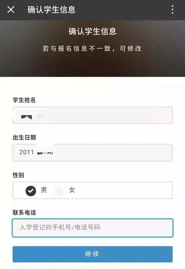 輸入入學(xué)登記手機(jī)號(hào)碼,確認(rèn)學(xué)生信息。