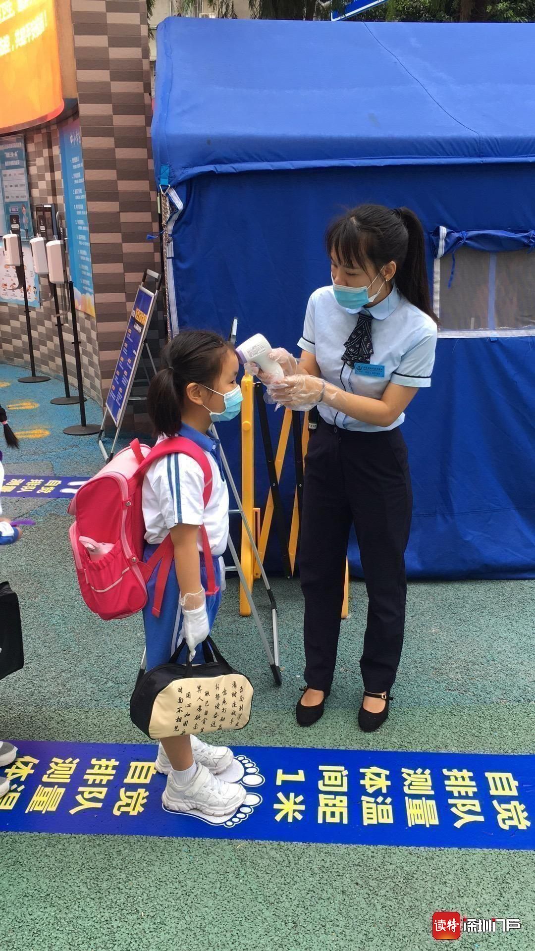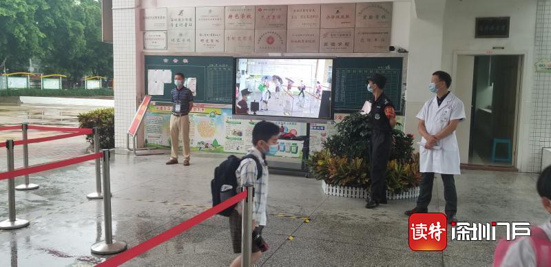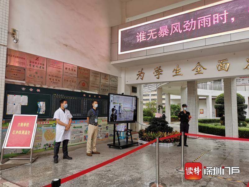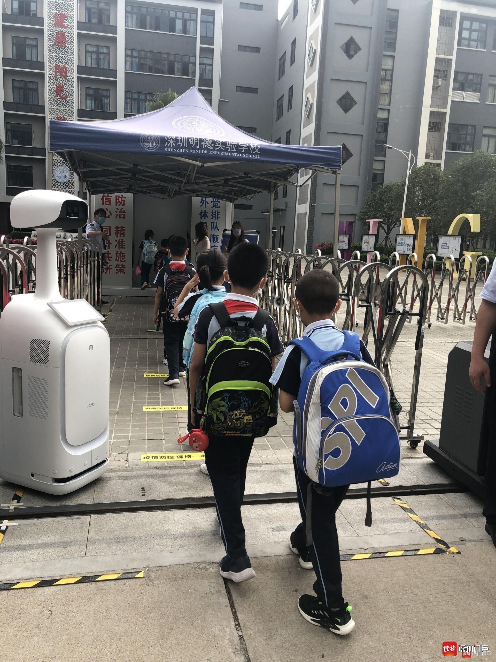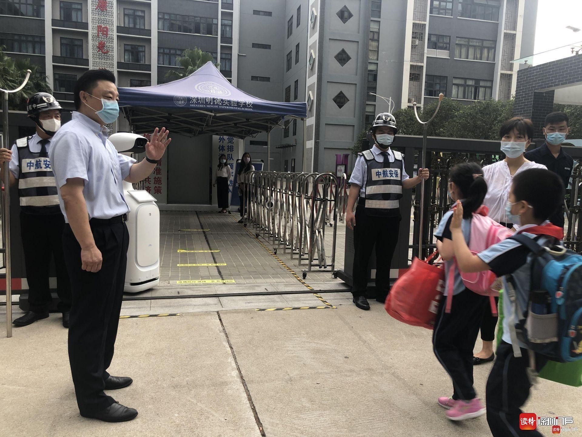 “同學們好!”“歡迎回來!”從7點起,明德實驗學校校長魯江與工作人員就在香蜜校區(qū)校門口迎候學生們,提醒孩子們戴好口罩,也與家長們交流返校事宜。校門口的一臺超氧水消殺機器人也在積極投入工作,工作人員在后臺控制面板可以監(jiān)測到入校人員的體溫情況。