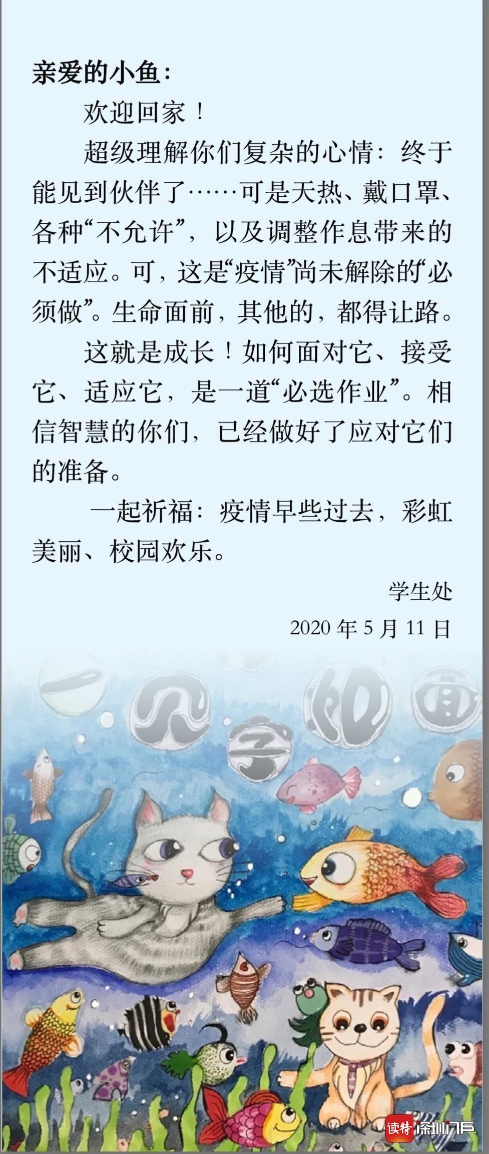 今日,翠北實驗小學1-3年級共有960名學生返學。學校為學生提供了“翠北五樣”小禮包,里面裝有雨衣、備用口罩、手帕、抹布和水杯。此外,學校還為學生設計準備了“萌版書簽”,上面有具體自我防護要求。老貓校長做復課講話后,到班級鼓勵小魚“老貓想你們了”。(讀特記者焦子宇)