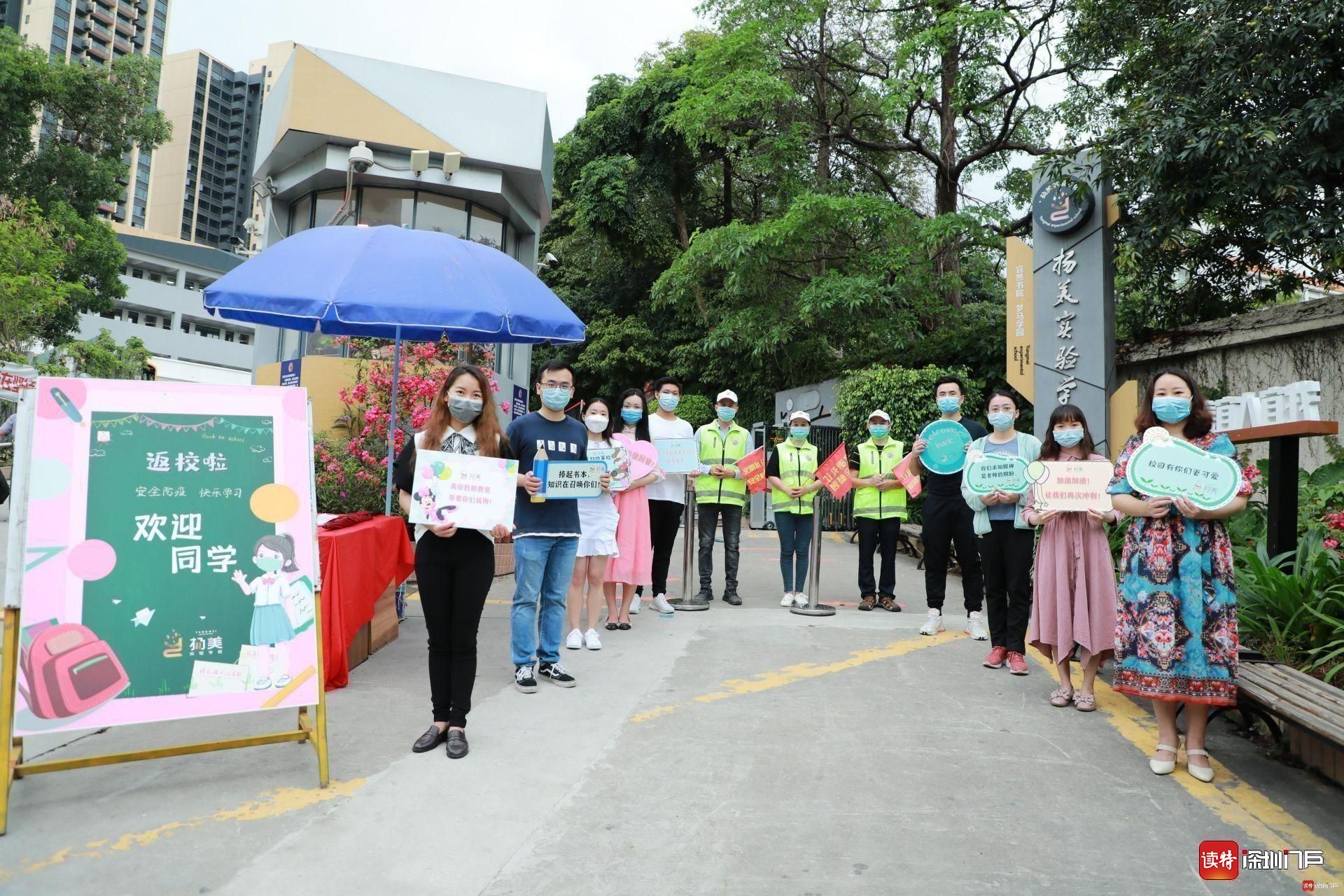 花城小學:點頭問好,微笑傳情,因為有愛,相隔一米。老師們站在校門口歡迎“小花”全面歸來?。ㄗx特記者李麗)