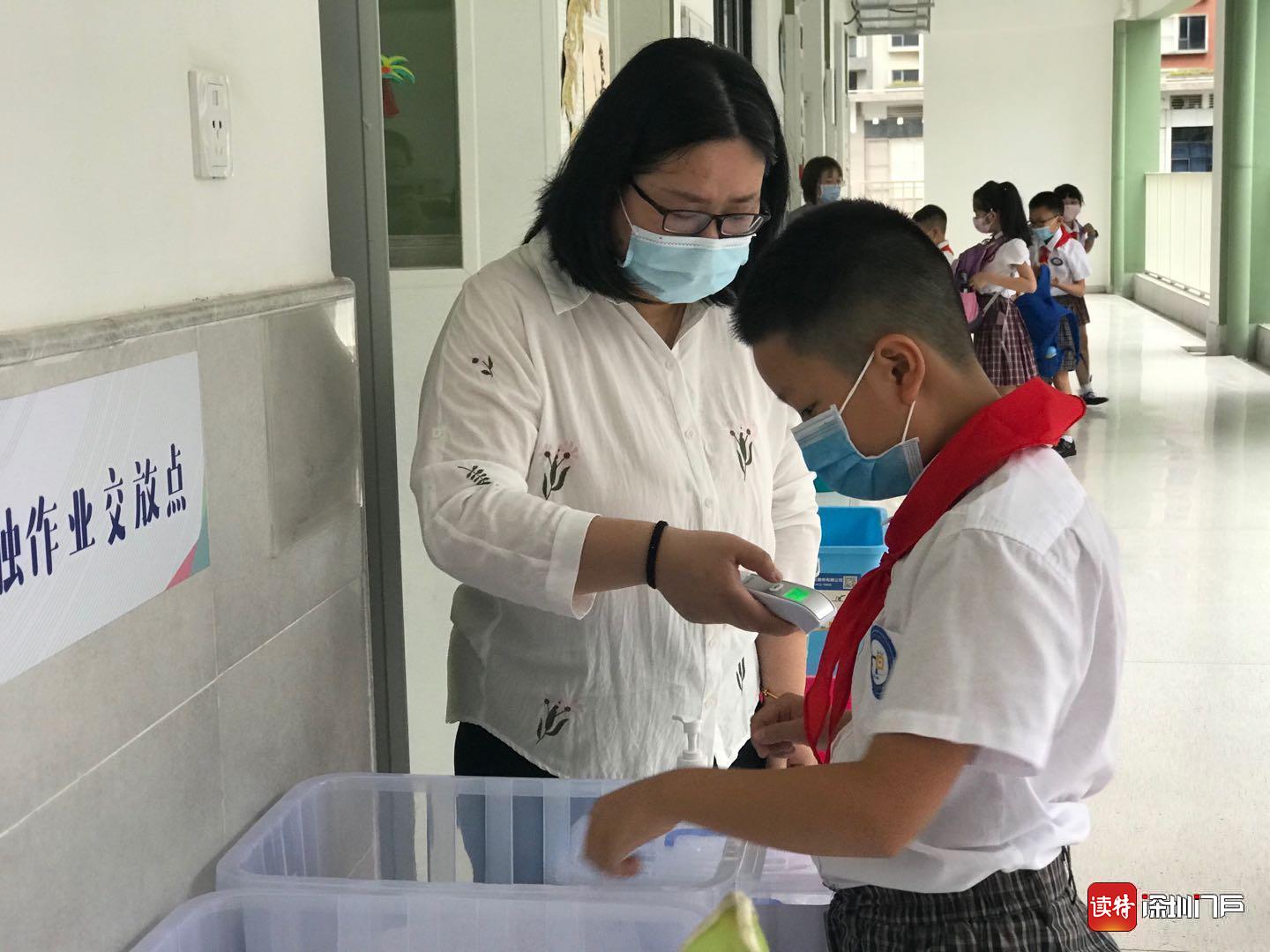 “同學們早上好!”“老師們好!”18日一大早,龍華區(qū)和平實驗小學的老師們都早早做好準備,站在學校門口,迎接孩子們歸來。在各班教室門口,學校還貼心的準備了“無接觸作業(yè)交站點”,同學們按順序自覺將學科作業(yè)放進箱內,減少了不必要的接觸。(讀特記者何亞南)