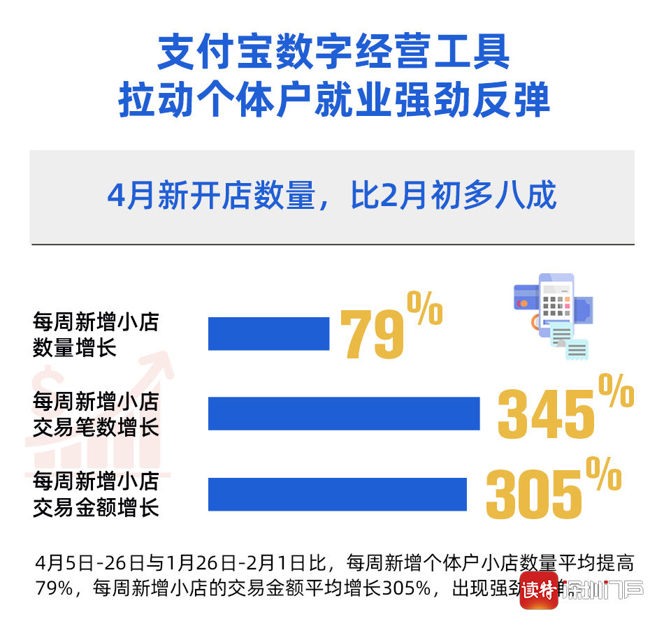 北京大學(xué)數(shù)字金融研究中心通過分析支付寶最新數(shù)據(jù)發(fā)現(xiàn),與疫情中最低點相比,全國個體戶就業(yè)形勢已出現(xiàn)強(qiáng)勁反彈:隨著復(fù)工復(fù)產(chǎn)的全面推進(jìn)和消費券的發(fā)放,4月以來與疫情最低點2月1日當(dāng)周相比,每周新增個體戶小店數(shù)量平均提高79%,每周新增小店的交易金額平均增長305%。