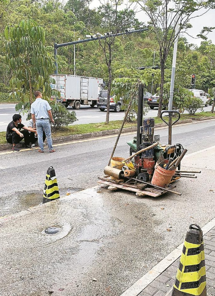 2020年5月1日,執(zhí)法支隊(duì)龍崗大隊(duì)執(zhí)法人員在轄區(qū)內(nèi)值班巡查時(shí),接到投訴稱愛南路上海外國語學(xué)校門口有道路施工人員鉆探時(shí)鉆破水管,現(xiàn)場水流滿地,請求執(zhí)法人員前往調(diào)查。