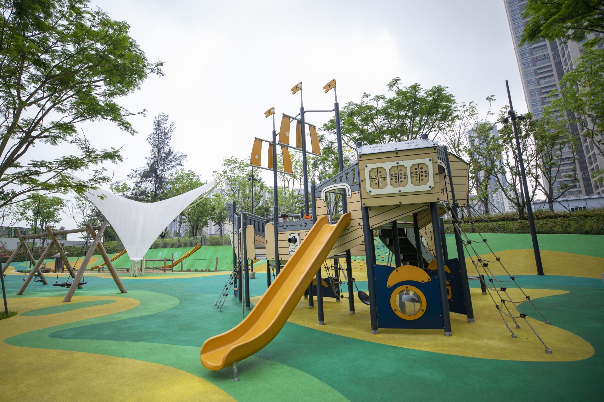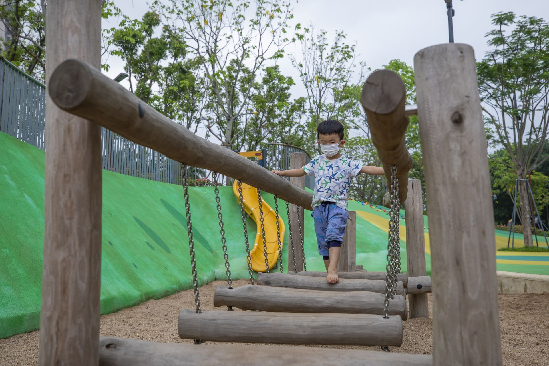 28日,記者從萬(wàn)象天地旁的沙河西路進(jìn)入位于大沙河生態(tài)長(zhǎng)廊中的大沖公園,這里設(shè)置了專(zhuān)門(mén)的兒童游樂(lè)區(qū),有三處長(zhǎng)短不一的趣味滑梯、沙池、海盜船、攀爬墻等設(shè)施。