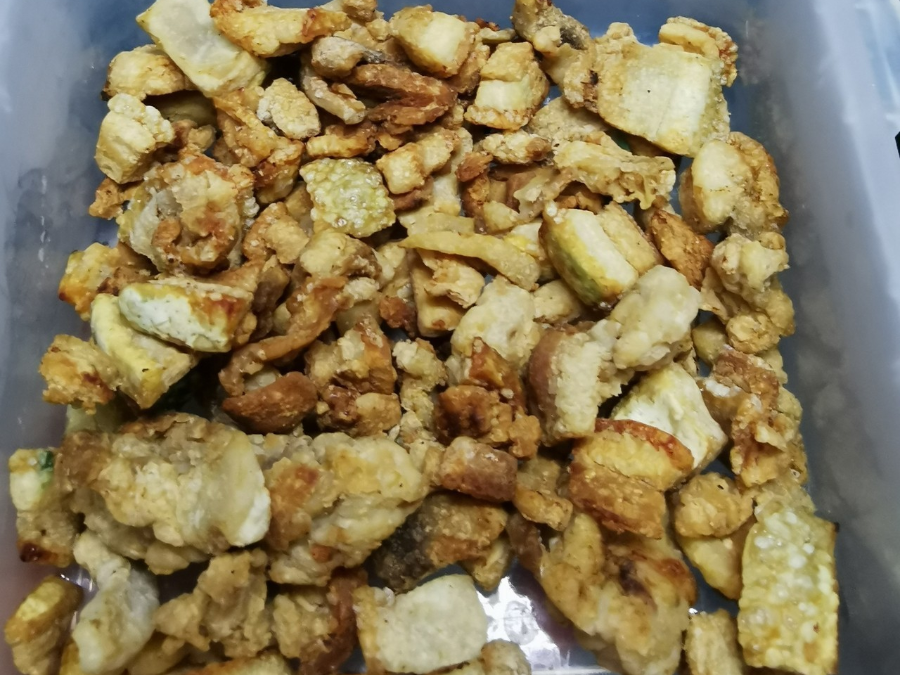 ▲爸爸媽媽童年最愛的零食是豬油渣,越嚼越香。
