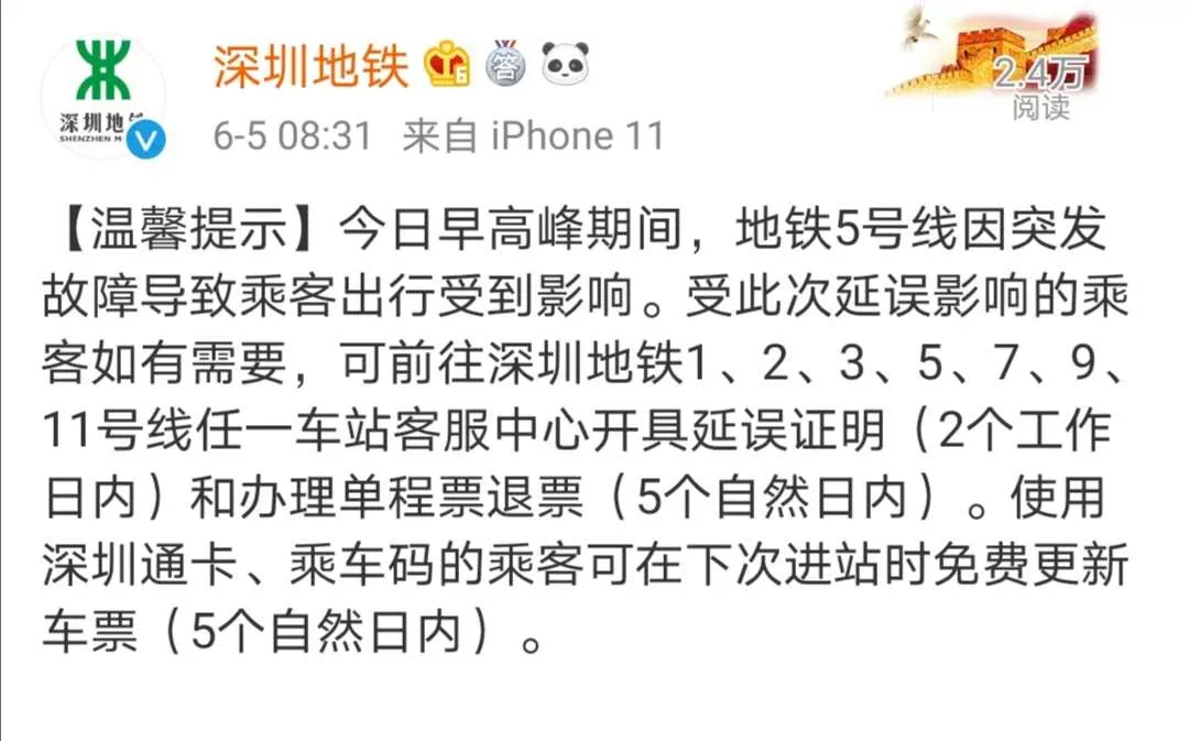 隨后,深圳地鐵官方微博發(fā)布溫馨提示,今日(6月5日)早高峰期間,地鐵5號線因突發(fā)故障導致乘客出行受到影響。受此次延誤影響的乘客如有需要,可前往深圳地鐵1、2、3、5、7、9、11號線任一車站客服中心開具延誤證明(2個工作日內)和辦理單程票退票(5個自然日內)。使用深圳通卡、乘車碼的乘客可在下次進站時免費更新車票(5個自然日內)。