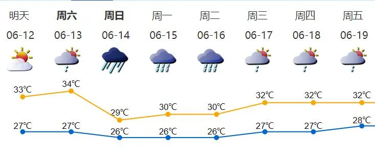12-13日多云,偶有短時(shí)(雷)陣雨,天氣炎熱;14-15日有一次明顯風(fēng)雨過程;16日仍有明顯降雨;17-18日多云,有陣雨或雷陣雨。