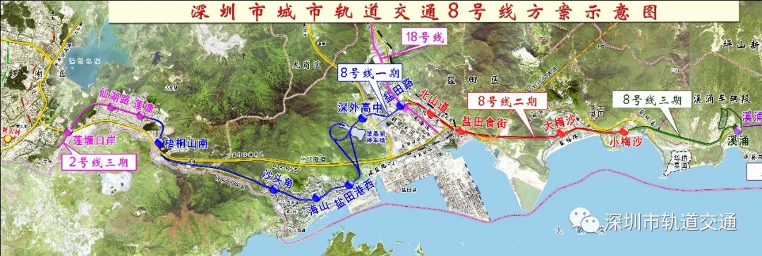 地鐵8號線一期由2號線三期蓮塘站站后接出,終點設于鹽田港后方陸域的鹽田路站,線路長約12.36km,均采用地下敷設。線路共設車站6座,包含蓮塘主所和望基湖停車場。預計于今年底開通初期運營。