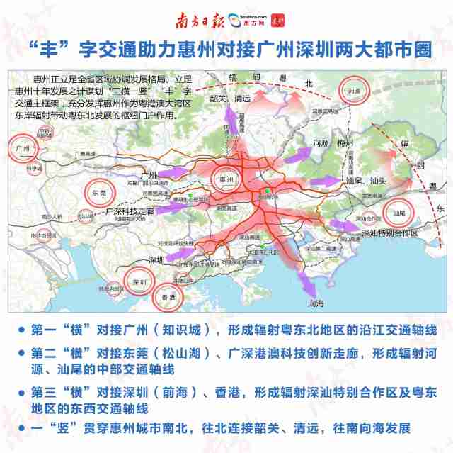 陳鴻宇舉例說,介于廣深兩大都市圈之間的惠州,大手筆規(guī)劃“豐”字交通主框架,向西分別對接廣州、東莞、深圳,向東輻射河源、汕尾等地,向北則連接韶關、清遠。類似這樣,各城市可緊密對接,推進更多跨城市、跨都市圈的合作。