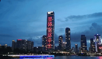 五座地標(biāo)建筑外墻光影變幻,四道標(biāo)語(yǔ)慢慢顯現(xiàn)出來(lái)。分別是:
