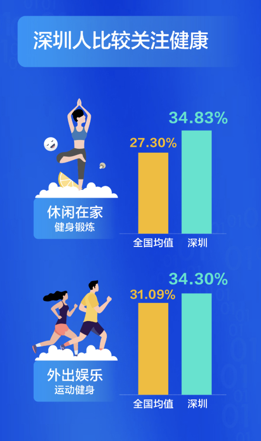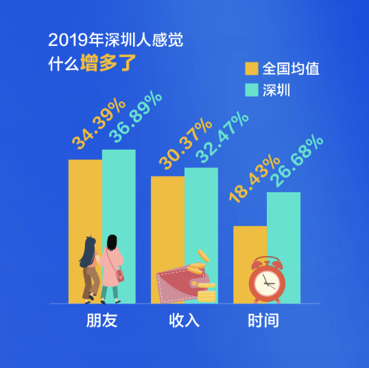 深圳人比較關(guān)注健康,不管是宅在家還是外出娛樂,他們選擇運(yùn)動(dòng)健身的比例都超過全國平均水平,對(duì)健康的投資,成就了又一個(gè)“苗條之城”。過去這一年,有四成的深圳人感覺自已“輕松”了,體重減少的人群比例高出全國近14個(gè)百分點(diǎn)。甩掉了贅肉的同時(shí),深圳人還感覺在時(shí)間、朋友、收入這三方面的收獲在增加。尤其是時(shí)間,超出了全國均值8個(gè)百分點(diǎn)。