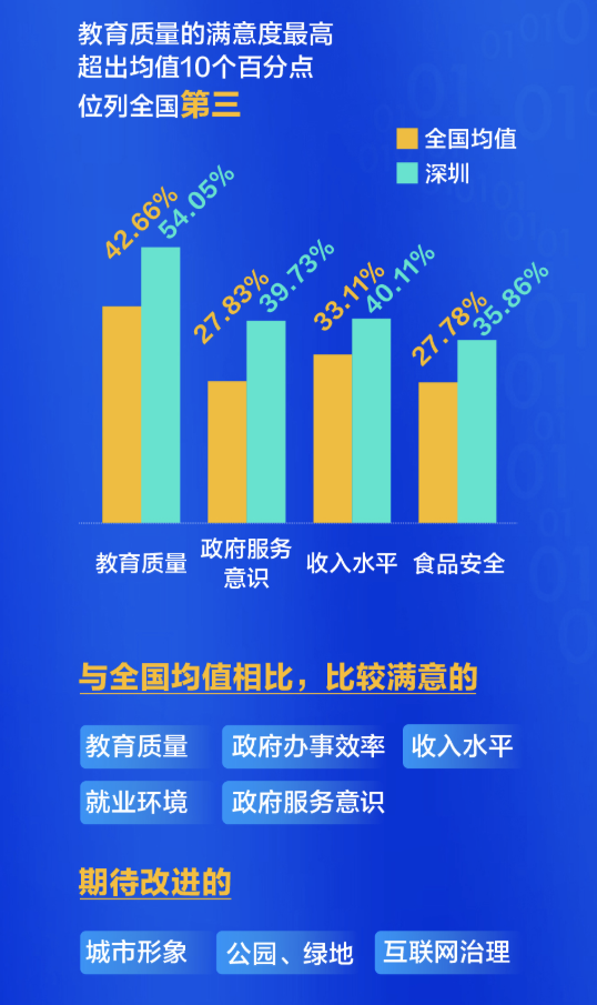 在針對(duì)城市治理能力和社會(huì)服務(wù)的20多項(xiàng)滿意度指標(biāo)中,深圳有19項(xiàng)高于全國省會(huì)城市和直轄市平均水平。其中,市民對(duì)教育服務(wù)的滿意度最高,超出均值10個(gè)百分點(diǎn),位列全國第三,其次是治安狀況和水、空氣質(zhì)量,而在政府服務(wù)意識(shí)和食品安全的滿意度,也排在全國同類第一名。此外,日常生活中的收入和就業(yè),也讓深圳人感覺比較踏實(shí)。