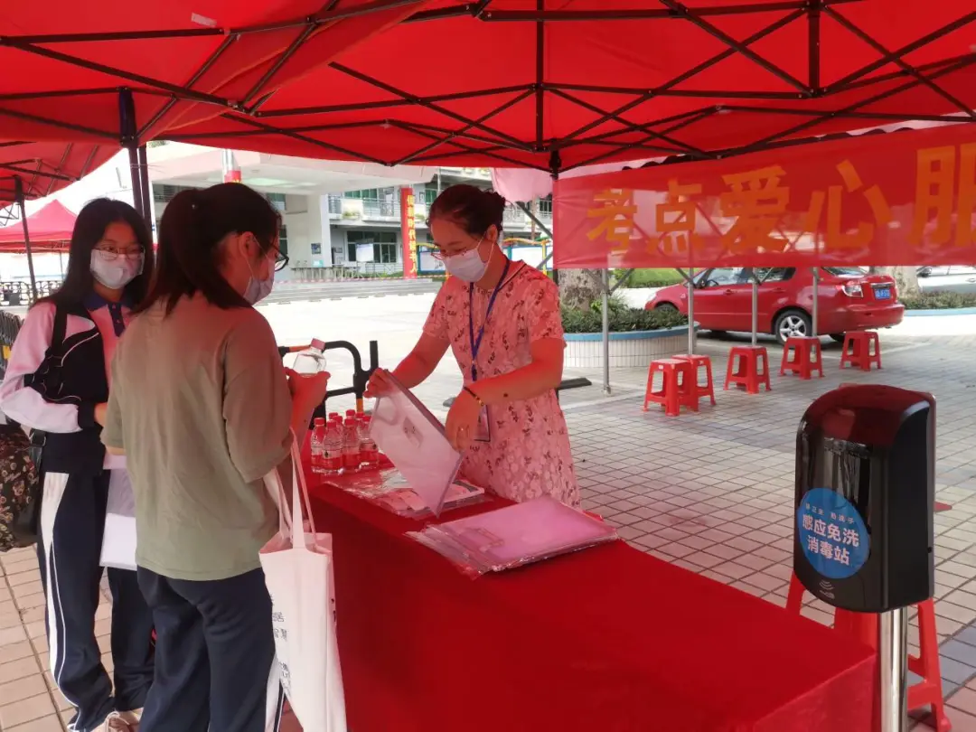 在現(xiàn)場,學(xué)校設(shè)有考點(diǎn)愛心服務(wù)站,為學(xué)生提供文件袋、口罩、礦泉水等物品。學(xué)校老師對前來領(lǐng)物資的學(xué)生說:“加油,祝你們考試順利!”