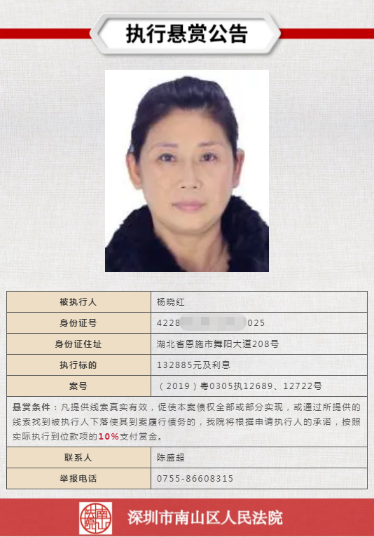經(jīng)申請(qǐng)執(zhí)行人申請(qǐng),深圳市南山區(qū)人民法院向社會(huì)發(fā)布懸賞舉報(bào)公告,凡提供線(xiàn)索真實(shí)有效,促使本案?jìng)鶛?quán)全部或部分實(shí)現(xiàn),或通過(guò)所提供的線(xiàn)索找到被執(zhí)行人下落使其到案履行債務(wù)的,深圳市南山區(qū)人民法院將根據(jù)申請(qǐng)執(zhí)行人的承諾,按照實(shí)際執(zhí)行到位款項(xiàng)給予一定金額的賞金。