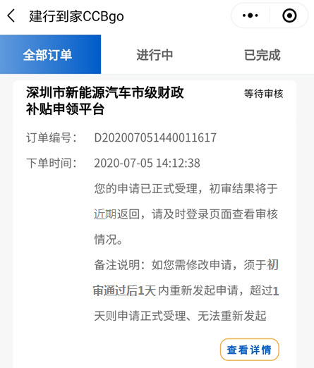 客戶完成補(bǔ)貼申請?zhí)峤缓?,平臺將進(jìn)行首次初審,初審結(jié)果將于近期返回并通過短信方式告知客戶。屆時,客戶可通過登錄“建行到家CCBgo-我的-我的申請”查看審核進(jìn)展。
