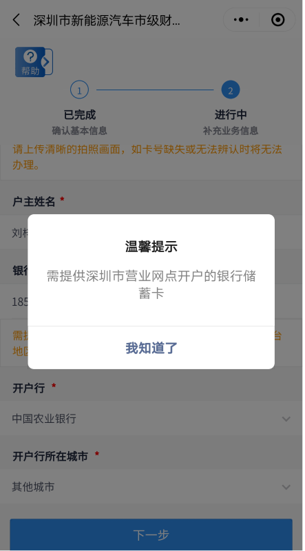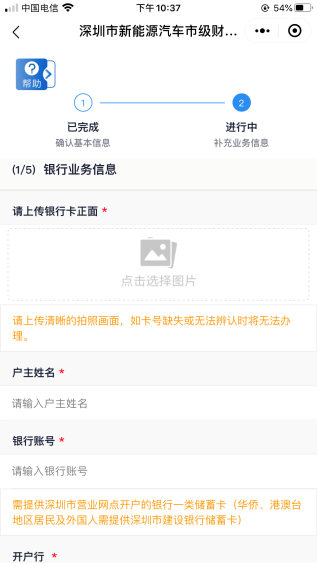 客戶需上傳銀行卡照片,并填寫銀行賬號、開戶行信息。開戶行如不在選項范圍內(nèi)可選擇“其他”自填。其中,銀行賬號需為深圳市營業(yè)網(wǎng)點(diǎn)開戶的銀行一類儲蓄卡,華僑、港澳臺地區(qū)居民及外國人需提供深圳市建設(shè)銀行一類儲蓄卡。