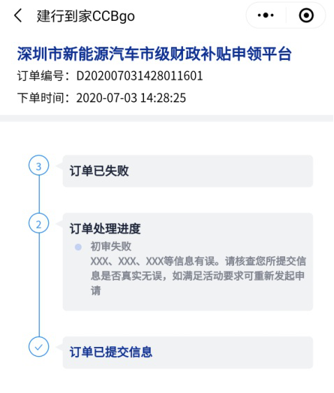 如客戶初審、終審失敗,重新進(jìn)入“深圳市新能源汽車市級財政補(bǔ)貼申領(lǐng)平臺”發(fā)起申請即可。