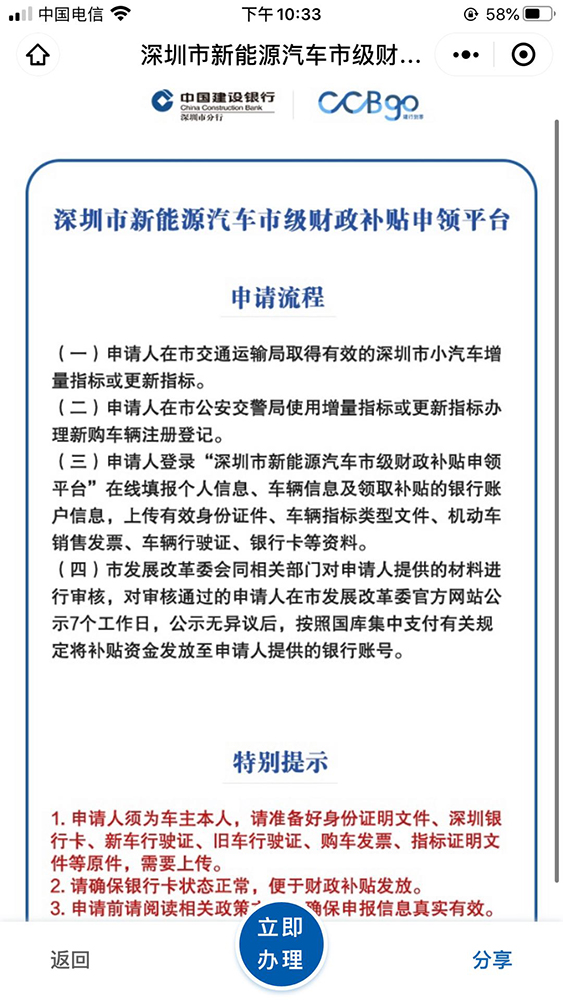 客戶進(jìn)入平臺后,可查詢平臺申請流程、注意事項。點(diǎn)擊“立即辦理”后,可進(jìn)一步在線閱讀《深圳市應(yīng)對新冠肺炎疫情影響促進(jìn)新能源汽車推廣應(yīng)用若干措施》、《深圳市應(yīng)對新冠肺炎疫情影響促進(jìn)新能源汽車推廣應(yīng)用若干措施財政補(bǔ)貼申領(lǐng)工作指引》等政府相關(guān)政策文件。