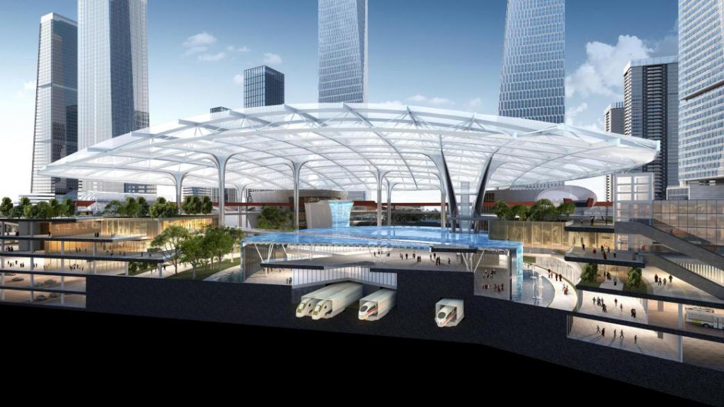 設計將新樞紐廣場融合城市公園、復合業(yè)態(tài)、多維換乘、自然意象、創(chuàng)意環(huán)境等多種場所,塑造多維體驗的城市超核和多維人群活動的北站都心。城市超核以豐富的空間層次融合室內(nèi)外觸媒,消除城市與樞紐界限,創(chuàng)造與城市功能相融合的等候空間,實現(xiàn)產(chǎn)業(yè)活力與自然活力共生,將車站、城市與自然和諧統(tǒng)一。