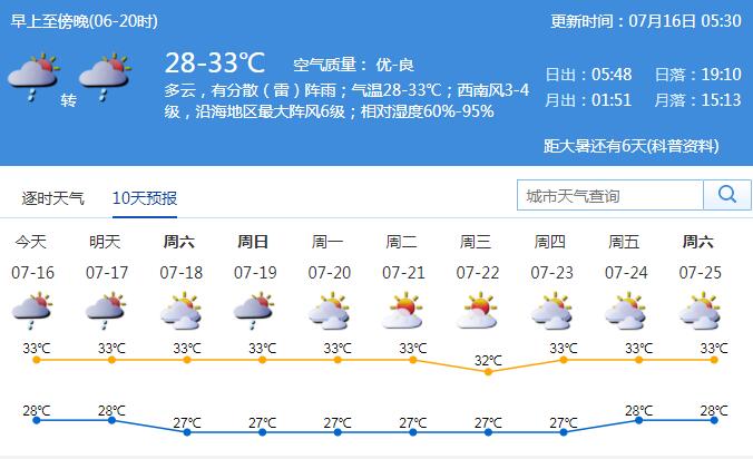 見(jiàn)圳客戶(hù)端·深圳新聞網(wǎng)2020年7月16日訊 未來(lái)一周天氣持續(xù)悶熱。16日多云間晴天,有分散(雷)陣雨;氣溫28-33℃,中北部地區(qū)最高氣溫35℃左右;西南風(fēng)3-4級(jí),沿海、高地和海區(qū)最大陣風(fēng)6級(jí);相對(duì)濕度55%-90%。17日多云,間中有分散(雷)陣雨;18-22日晴天間多云,局地偶有(雷)陣雨。