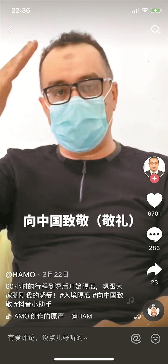 在方哈默所有抖音視頻中,點(diǎn)贊量最高的是對(duì)中國(guó)防疫工作兩次真情的致敬,他希望能借此呼吁所有入境人員都能百分之百遵從政府安排?!拔蚁M苡懈嗳丝梢钥吹街袊?guó)的防疫措施?!狈焦谝曨l中說道,“中國(guó)所有的防疫工作者都很贊,他們24小時(shí)不間斷工作,你根本想象不到有多辛苦,我希望每個(gè)入境人員都百分之百遵守政府的安排。”他滿懷信心地表示,接下來也會(huì)把在羅湖的抗疫短視頻拍下去,希望借此機(jī)會(huì)可以把中國(guó)的聲音傳到更遠(yuǎn)的地方,向世界傳遞中國(guó)力量。