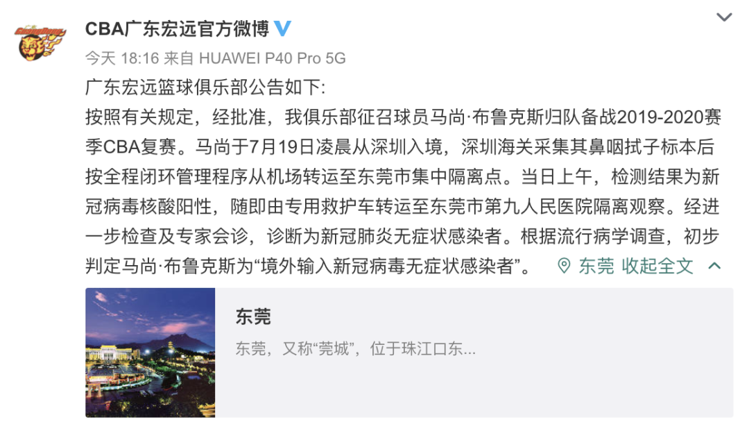 7月19日,廣東新增境外輸入無癥狀感染者1例,為東莞報(bào)告,來自美國(guó),在入境口岸發(fā)現(xiàn)。經(jīng)確認(rèn),此人是CBA廣東宏遠(yuǎn)男籃外援馬尚·布魯克斯。