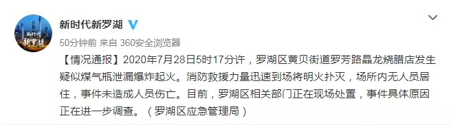 【情況通報】2020年7月28日5時17分許,羅湖區(qū)黃貝街道羅芳路晶龍燒臘店發(fā)生疑似煤氣瓶泄漏爆炸起火。消防救援力量迅速到場將明火撲滅,場所內(nèi)無人員居住,事件未造成人員傷亡。目前,羅湖區(qū)相關(guān)部門正在現(xiàn)場處置,事件具體原因正在進一步調(diào)查。(羅湖區(qū)應(yīng)急管理局)