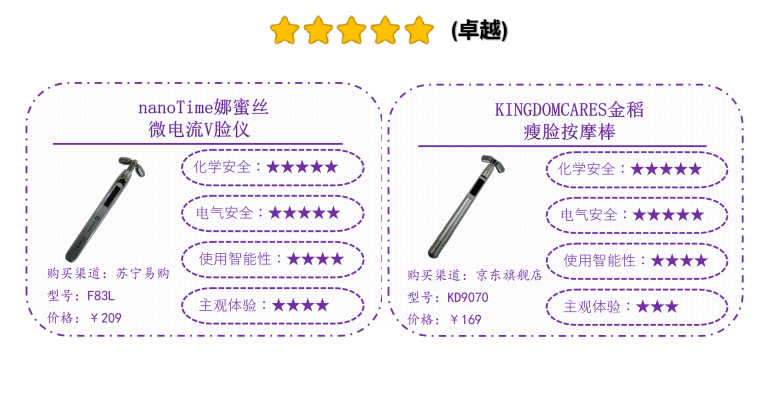 經(jīng)測試,綜合化學(xué)安全、電氣安全、使用智能性、主觀體驗(yàn)等消費(fèi)者關(guān)心的多個(gè)維度,2款微電流型家用美容儀和1款電離子型美容儀品質(zhì)領(lǐng)跑表現(xiàn)卓越,分別為,國產(chǎn)品牌nanoTime娜蜜絲F83L微電流V臉儀和KINGDOMCARES金稻 KD9070瘦臉按摩棒;日本品牌Panasonic松下 EH-ST50面部護(hù)理器(溫?zé)犭x子美容儀)。