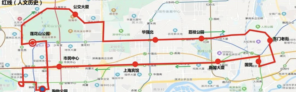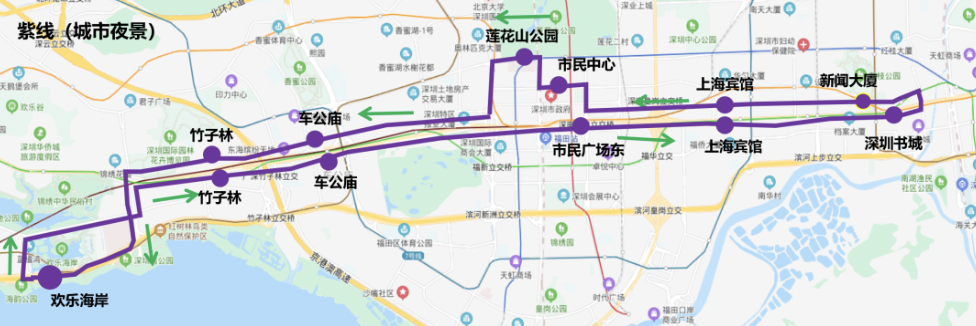 停靠站點:歡樂海岸→竹子林→車公廟→市民廣場東→上海賓館→深圳書城→新聞大廈→上海賓館→市民中心→蓮花山公園→車公廟→歡樂海岸