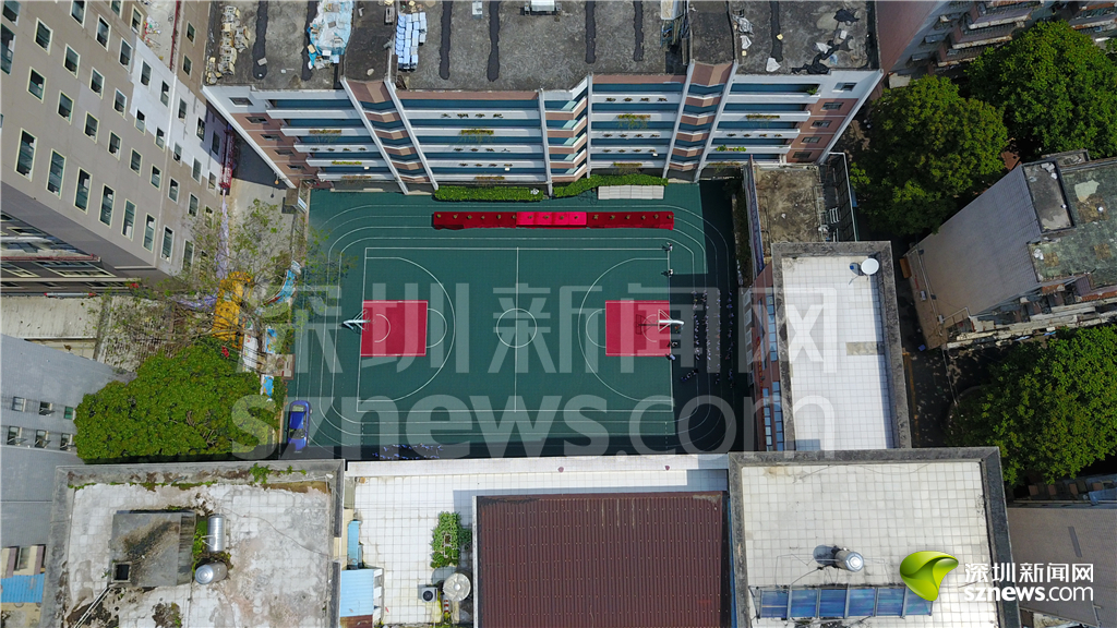 白石洲城中村內(nèi)的南山星河學(xué)校籃球場(chǎng)