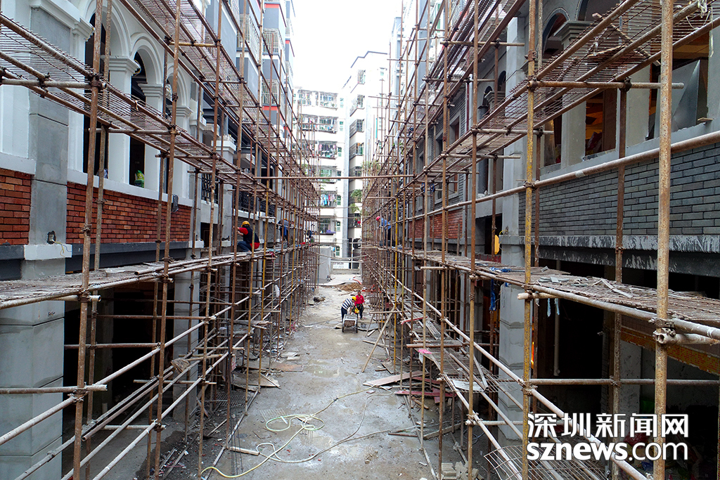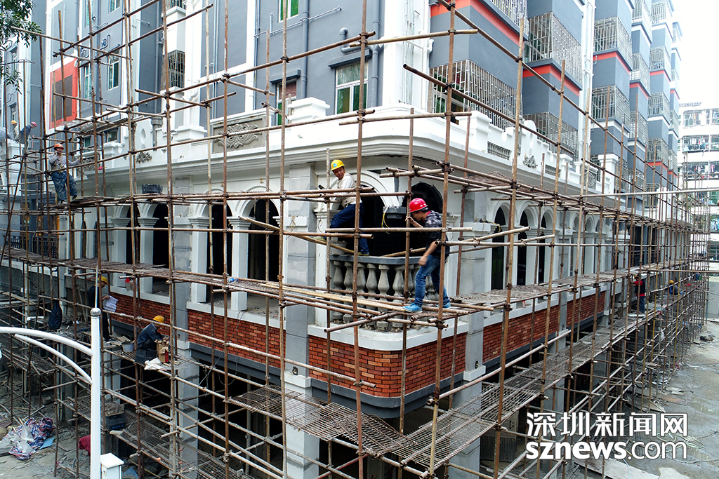 12月14日下午,水圍村改造的村民房的建筑鋼架還沒有拆除,建筑工人正在對(duì)外立面進(jìn)行粉刷