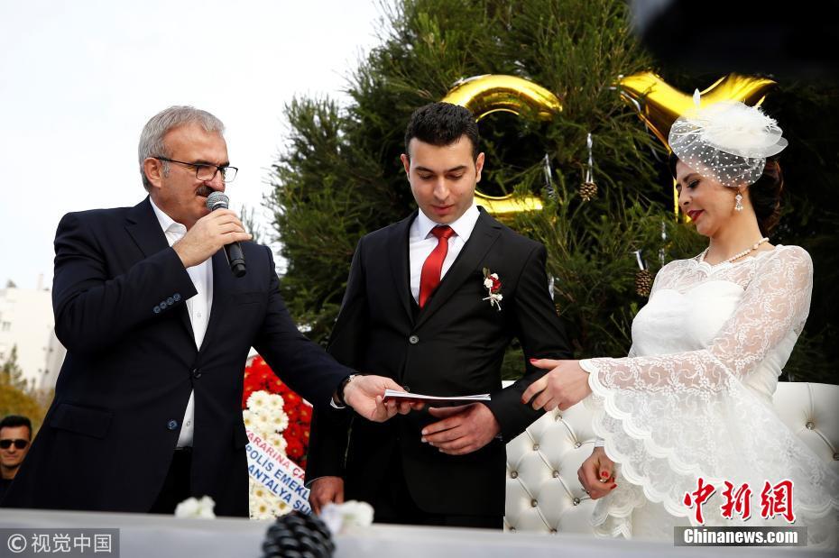 當(dāng)?shù)貢r(shí)間2018年3月21日,土耳其安塔利亞,警官Ceren Ekici和Taha YasinGul舉行婚禮。在10個(gè)月前的一次行動(dòng)中,Taha YasinGul不慎開槍擊中Ceren Ekici的頭部,所幸沒(méi)有造成生命危險(xiǎn)。他們的婚禮由警局同事操辦,同事們舉著防彈盾牌,護(hù)送這對(duì)新人走向禮臺(tái)。圖片來(lái)源:視覺(jué)中國(guó)
