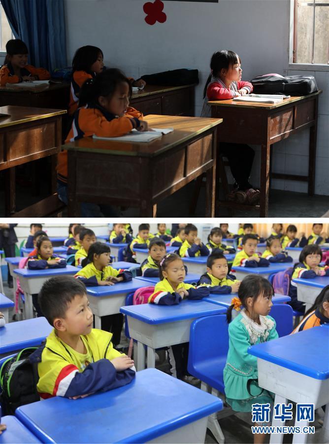 拼版照片:上圖為7歲的李曉彤(右一)在華山小學(xué)教室內(nèi)晨讀(4月27日攝);下圖為7歲的李曉彤(前排左二)在黔西縣第十小學(xué)教室內(nèi)上課(5月7日攝)。貴州省黔西縣金蘭鎮(zhèn)瓦房村哈沖組位于六沖河岸邊的崖壁下,哈沖組的孩子們每天要往返崖壁上的山路才能到達(dá)華山小學(xué)就讀。28年來,崖壁上約4公里山路成了當(dāng)?shù)孛缱鍖W(xué)生艱難危險的求學(xué)路。 5月5日起,哈沖組里的苗族同胞陸續(xù)通過易地扶貧搬遷至縣城的錦繡花都安置點(diǎn),孩子們也陸續(xù)搬至黔西縣第十小學(xué)就讀。自此,孩子們的上學(xué)路從約2個小時艱難跋涉的崖壁山路變?yōu)椴叫兄恍枰胄r的公路。求學(xué)之路“天塹變通途”,哈沖組村民幾代人的崖壁求學(xué)路成為歷史。新華社記者歐東衢攝