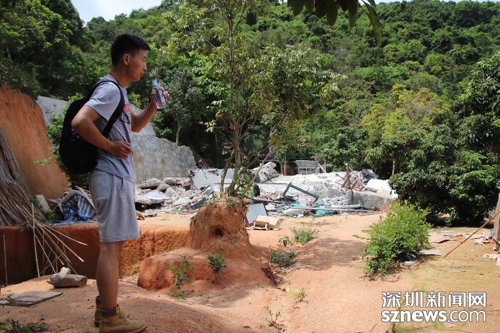5月16日,深圳新聞網(wǎng)記者爬上羊臺(tái)山,用無人機(jī)和相機(jī)拍下羊臺(tái)山毀林案件涉案的兩棟違法建筑拆除后的情景。記者從羊臺(tái)山隱蔽的一處登山,山路崎嶇且陡峭,沿路都是荔枝林,多頭大型犬見到陌生人狂吠不已。耗時(shí)三四十分鐘登臨山腰,可俯瞰西麗水庫,視野極佳。