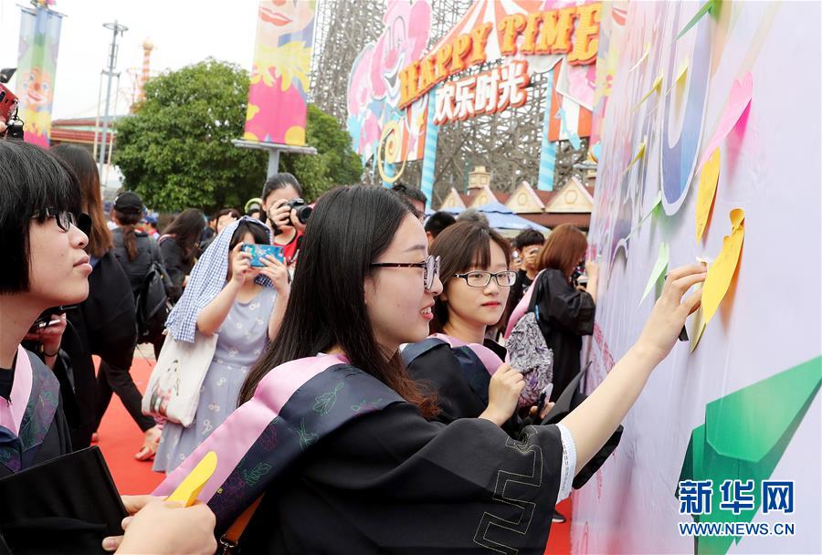 6月10日,畢業(yè)生們將寫著自己畢業(yè)愿望的貼紙貼到留言墻上。 新華社記者 方喆攝