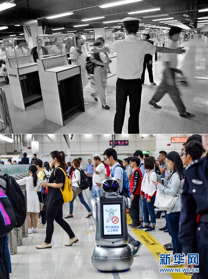 拼版照片:上圖為旅客經過深圳羅湖口岸(資料照片,新華社記者陳小波攝);下圖為2018年4月6日,在深圳灣口岸出境大廳,機器人在自助查驗通道前對旅客進行提示(新華社記者毛思倩攝)。新華社發(fā)
