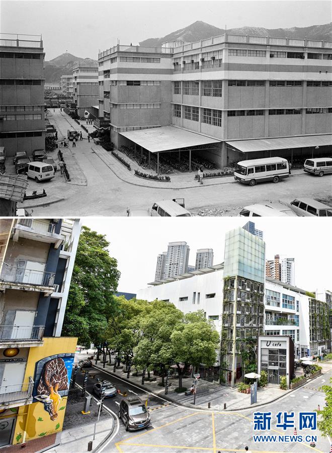 拼版照片:上圖為位于深圳蛇口工業(yè)區(qū)的三洋電機(蛇口)有限公司廠房外景(資料照片,新華社記者李長永攝);下圖為2018年6月20日拍攝的原三洋電機(蛇口)有限公司廠房(新華社記者毛思倩攝)。這些廠房已經被打造成為南海意庫創(chuàng)意產業(yè)園,里面匯聚了咖啡館、服裝店、設計工作室等文創(chuàng)項目。新華社發(fā)