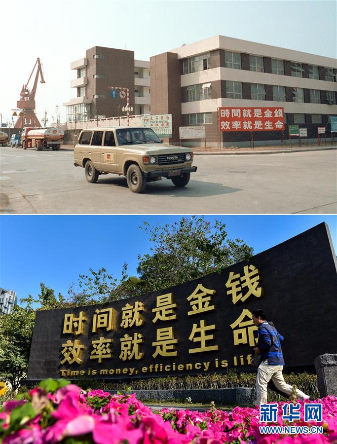 拼版照片:上圖為深圳蛇口工業(yè)區(qū)辦公大廈(資料照片,新華社記者徐佑珠攝);下圖為2015年2月24日,一名男子走過深圳蛇口時間廣場的“時間就是金錢,效率就是生命”牌(新華社記者毛思倩攝)。新華社發(fā)