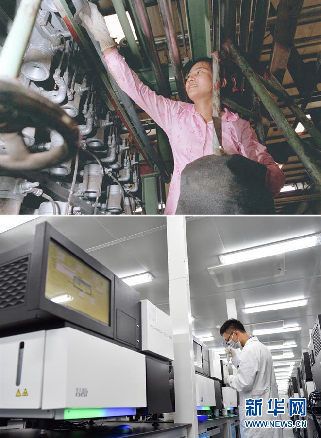 拼版照片:上圖為工人在位于深圳大鵬灣的一家染廠工作(資料照片,新華社記者楊紹明攝);下圖為2017年7月13日,工作人員在國家基因庫操作基因測序儀(新華社記者毛思倩攝)。建設于大鵬灣畔的深圳國家基因庫于2011年由國家發(fā)改委等部委批復,2016年9月22日正式開業(yè)。新華社發(fā)