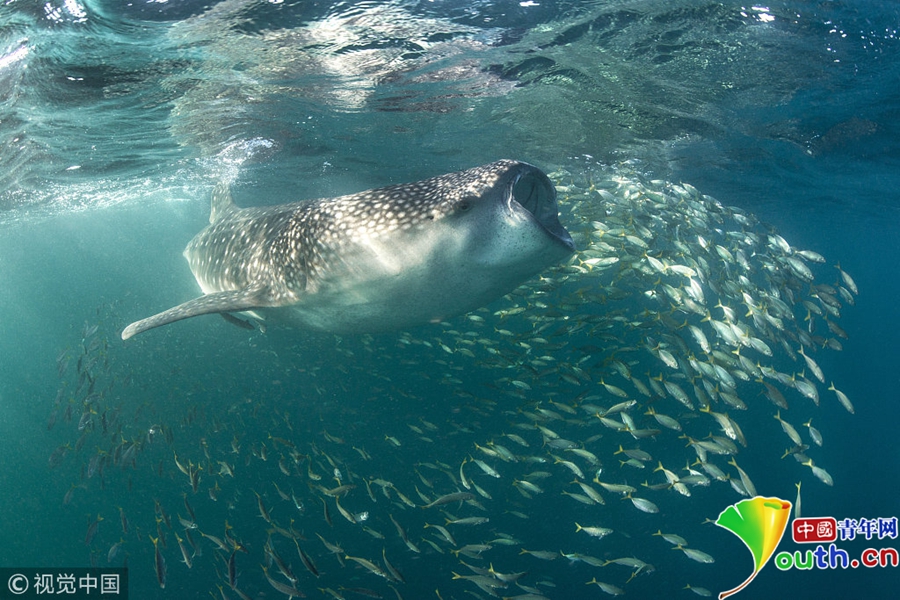 2018年3月30日訊(具體拍攝時(shí)間不詳),非洲,一只鯨鯊張開(kāi)大嘴試圖吞下似龍卷風(fēng)盤(pán)旋著的浮游生物群。