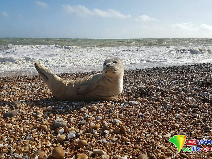 英國肯特郡鄧杰內(nèi)斯,46歲的達倫·伍德帶著鄰居家的孩子們釣魚,這只可愛的海豹爬出海面跟他們“打招呼”。