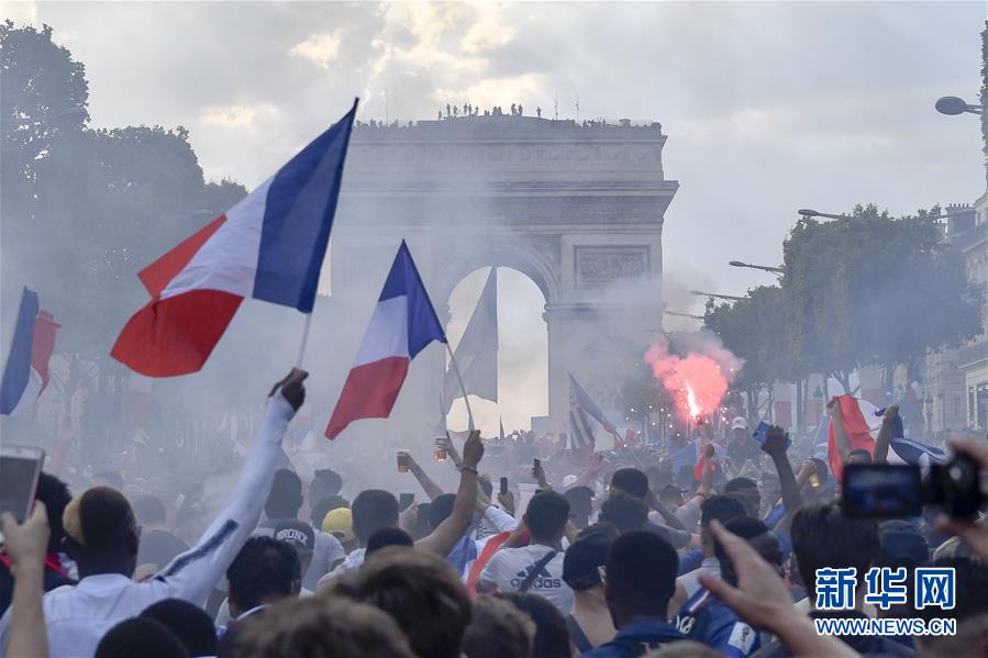7月15日,法國(guó)球迷在巴黎香榭麗舍大街上慶祝法國(guó)隊(duì)奪冠。