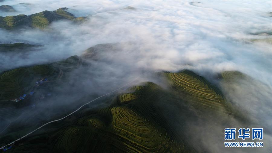 云霧繚繞的寧夏彭陽(yáng)縣金雞坪梯田公園(7月17日無(wú)人機(jī)拍攝)。 新華社記者 王鵬 攝