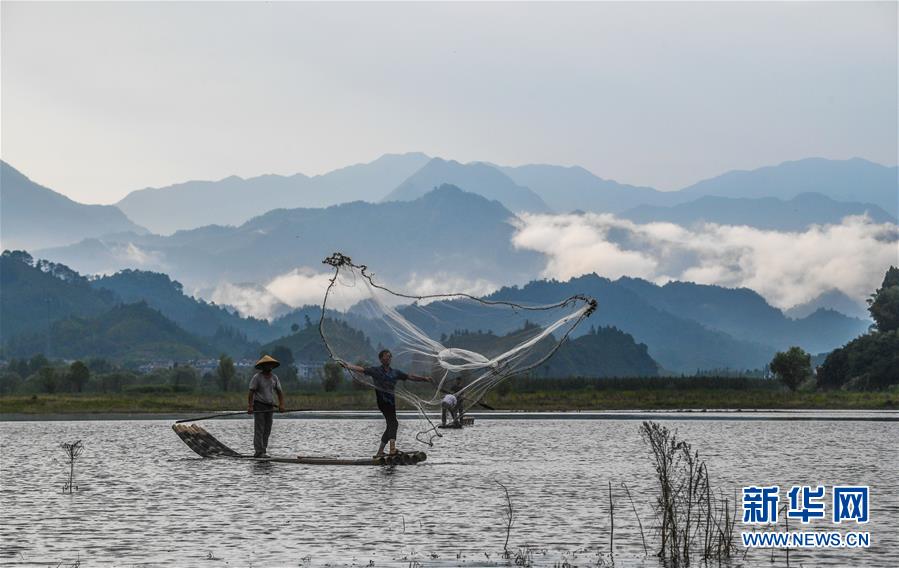 8月1日,淳安縣汾口鎮(zhèn)紅星村的漁民乘著竹排,在千島湖的支流武強溪上進行撒網捕撈作業(yè)。新華社記者 徐昱 攝
