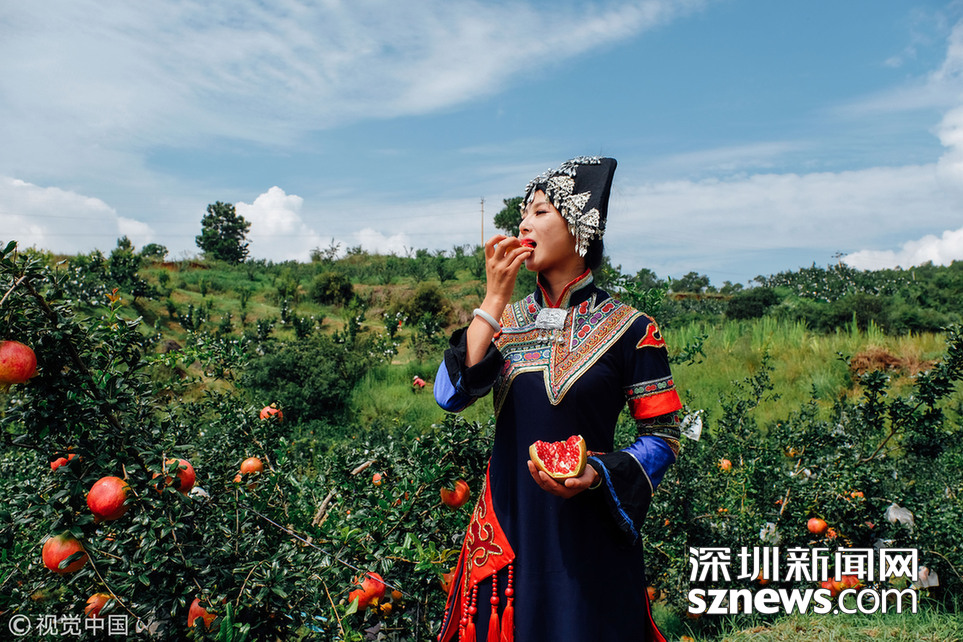 會理如今大面積種植來自北非突尼斯的軟籽石榴,籽粒柔軟,可以直接食用無需吐籽,果味兒濃甜似蜂蜜,可食部位達55.7%,自然儲藏可達3個月,冷庫儲藏可達5個月,是目前世界上籽粒最軟的石榴品種,也是中國石榴最優(yōu)秀的品種。拍攝當天氣溫有些高,鄧通敏穿著比較厚的彝族服裝。完成拍攝后,她迫不及待想嘗嘗這剛從樹上摘下來的果子?!疤瓦m了!”鄧通敏說。