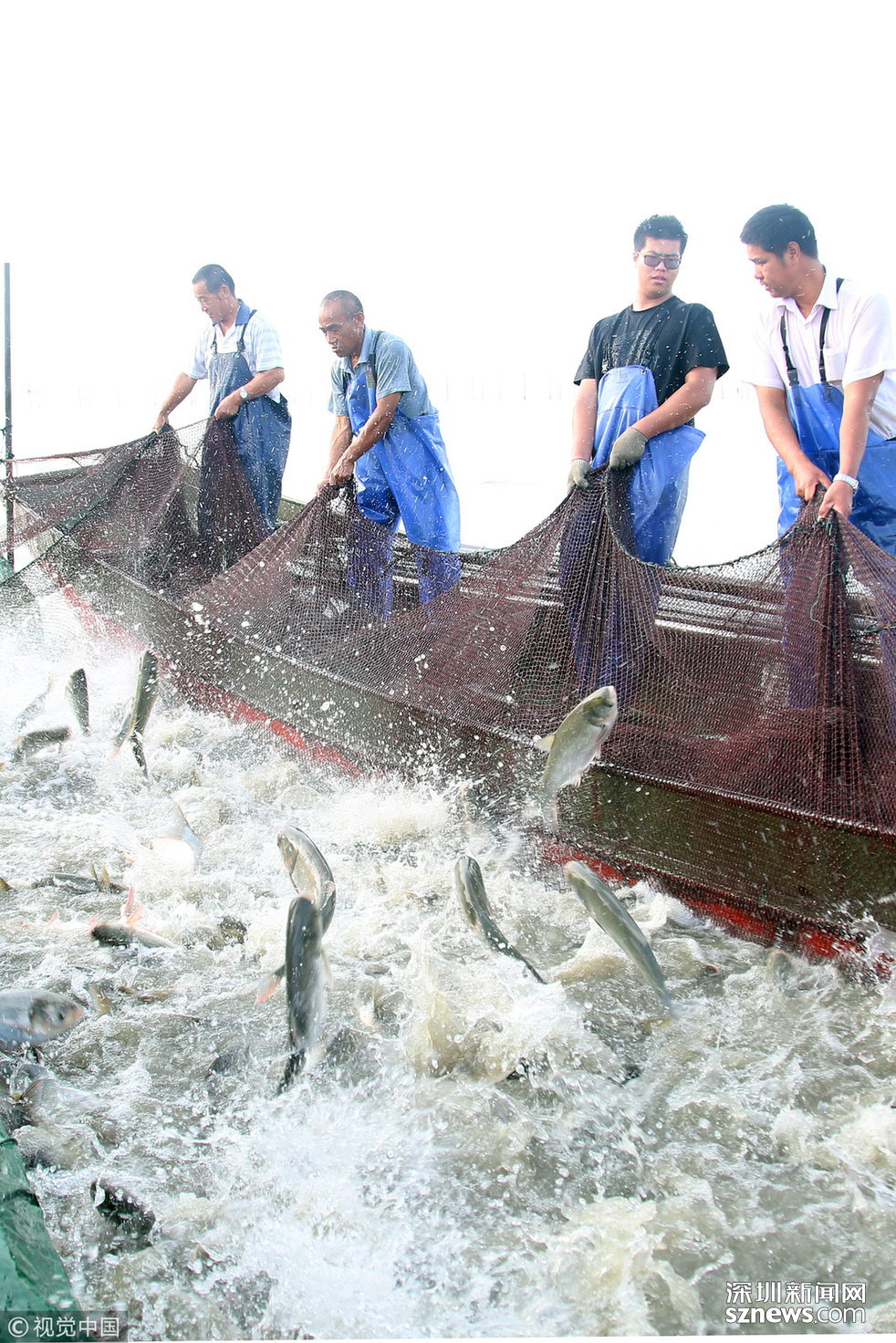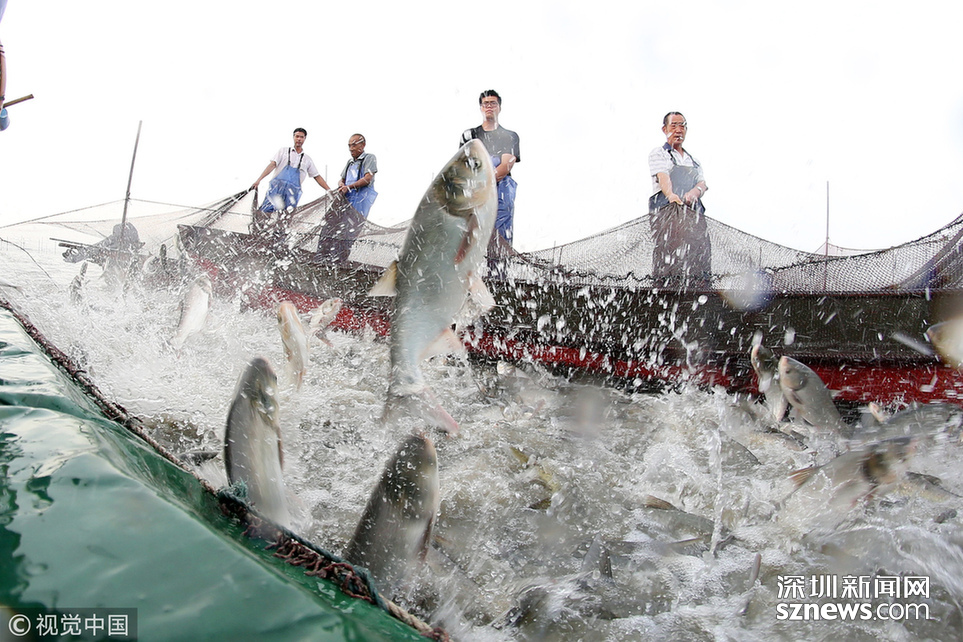 ???? 2018年6月26日,江蘇省常州市嘉澤鎮(zhèn)捕撈村的漁民組織夏季捕撈,一網(wǎng)魚達(dá)五萬余斤,以鰱魚為主,供應(yīng)市場需求。夏捕的魚價較平時有所上漲,漁民粗略估計可增收上萬余元。