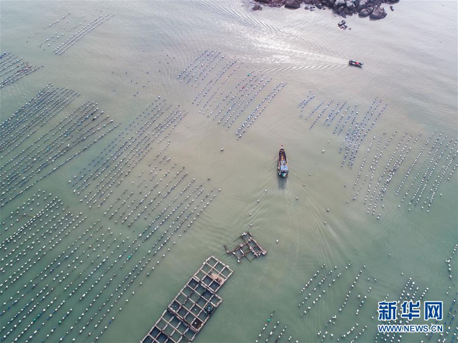 8月18日,南麂島海域的“海上牧場”養(yǎng)殖區(qū)內(nèi),漁民準(zhǔn)備進(jìn)行養(yǎng)殖作業(yè)(無人機拍攝)。進(jìn)入8月,浙江省溫州市平陽縣南麂鎮(zhèn)海域上大片的大黃魚、貽貝等特色海產(chǎn)品養(yǎng)殖區(qū)域迎來豐收季節(jié),養(yǎng)殖戶們駕駛漁船在養(yǎng)殖區(qū)海域進(jìn)行打撈收獲,在碧海藍(lán)天下構(gòu)成了一幅“海上牧場”的美麗豐收景象。近年來,南麂鎮(zhèn)政府引導(dǎo)漁民養(yǎng)殖戶充分發(fā)揮“靠海吃?!钡馁Y源優(yōu)勢,大力發(fā)展海洋養(yǎng)殖經(jīng)濟(jì)和海島旅游經(jīng)濟(jì),實現(xiàn)了南麂由“生態(tài)美”向“產(chǎn)業(yè)美”,“產(chǎn)業(yè)美”向“經(jīng)濟(jì)美”的轉(zhuǎn)變。同時該鎮(zhèn)堅持以大黃魚、貽貝等為特色產(chǎn)業(yè)支撐,精準(zhǔn)發(fā)展高效海洋養(yǎng)殖業(yè),重點培養(yǎng)一批新型職業(yè)漁民,依靠專業(yè)技術(shù)支持,實現(xiàn)深海仿生養(yǎng)殖,讓好生態(tài)造就好品質(zhì),重點打造南麂養(yǎng)殖品牌,組建營銷網(wǎng)絡(luò),拓展特色海產(chǎn)品市場。新華社記者 徐昱攝