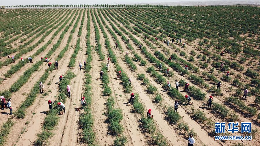 紅寺堡生態(tài)移民區(qū)的移民在百瑞源枸杞種植基地采摘頭茬枸杞(5月30日無人機拍攝)。近日,在寧夏吳忠市紅寺堡區(qū)百瑞源枸杞種植基地,頭茬枸杞迎來采摘收獲季。今年頭茬枸杞采摘期比往年提前20天左右。據(jù)了解,該基地地處紅寺堡生態(tài)移民區(qū),占地3000畝,采摘季節(jié)每天有數(shù)百名當(dāng)?shù)匾泼裨谔镩g采摘勞作。新華社記者王鵬 攝