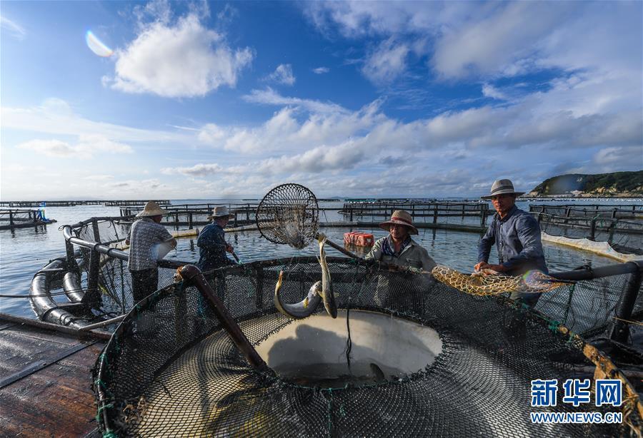 8月18日,南麂島海域內(nèi)的“海上牧場(chǎng)”養(yǎng)殖區(qū)內(nèi),漁民正捕撈大黃魚(yú),處于仿生養(yǎng)殖環(huán)境的大黃魚(yú)需要生長(zhǎng)2至3年。進(jìn)入8月,浙江省溫州市平陽(yáng)縣南麂鎮(zhèn)海域上大片的大黃魚(yú)、貽貝等特色海產(chǎn)品養(yǎng)殖區(qū)域迎來(lái)豐收季節(jié),養(yǎng)殖戶(hù)們駕駛漁船在養(yǎng)殖區(qū)海域進(jìn)行打撈收獲,在碧海藍(lán)天下構(gòu)成了一幅“海上牧場(chǎng)”的美麗豐收景象。近年來(lái),南麂鎮(zhèn)政府引導(dǎo)漁民養(yǎng)殖戶(hù)充分發(fā)揮“靠海吃?!钡馁Y源優(yōu)勢(shì),大力發(fā)展海洋養(yǎng)殖經(jīng)濟(jì)和海島旅游經(jīng)濟(jì),實(shí)現(xiàn)了南麂由“生態(tài)美”向“產(chǎn)業(yè)美”,“產(chǎn)業(yè)美”向“經(jīng)濟(jì)美”的轉(zhuǎn)變。同時(shí)該鎮(zhèn)堅(jiān)持以大黃魚(yú)、貽貝等為特色產(chǎn)業(yè)支撐,精準(zhǔn)發(fā)展高效海洋養(yǎng)殖業(yè),重點(diǎn)培養(yǎng)一批新型職業(yè)漁民,依靠專(zhuān)業(yè)技術(shù)支持,實(shí)現(xiàn)深海仿生養(yǎng)殖,讓好生態(tài)造就好品質(zhì),重點(diǎn)打造南麂養(yǎng)殖品牌,組建營(yíng)銷(xiāo)網(wǎng)絡(luò),拓展特色海產(chǎn)品市場(chǎng)。新華社記者 徐昱攝