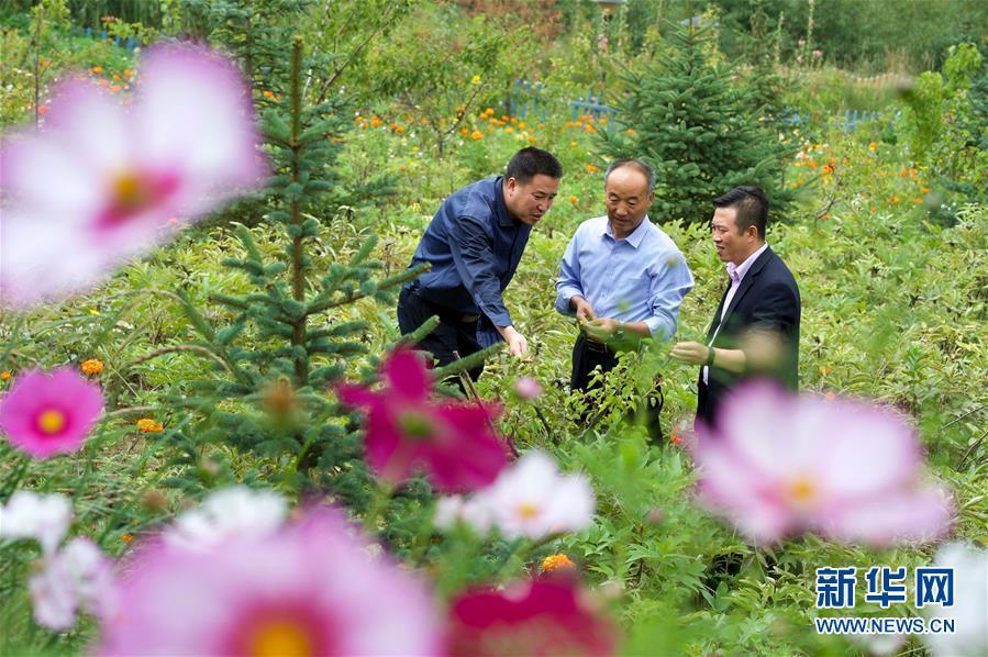 在寧夏固原市西吉縣吉強(qiáng)鎮(zhèn)龍王壩村,固原市農(nóng)業(yè)學(xué)校林業(yè)高級(jí)講師鄧志力(中)在指導(dǎo)村民進(jìn)行油用牡丹種植(8月30日攝)。